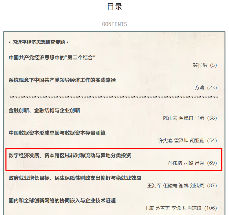 近日,beat365联合研究院孙伟增教授与中央财经大学司璐博士、对外经济贸易大学吕越教授合作的论文《数字经济发展、资本跨区域非对称流动与异地分类投资》在《经济研究》2025年第3期公开发表。