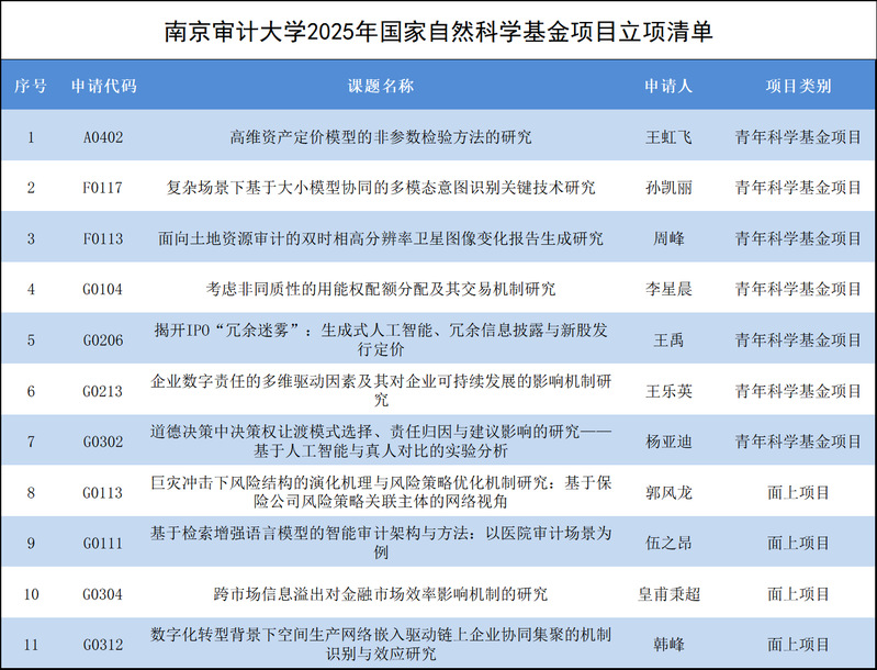 另外,2025国家自然科学基金立项情况,beat365官方网站获批立项11项,其中青年科学基金项目7项,占比过半。学校始终注重青年学者的成长,不断为其发展营造更好的环境和生态,相信未来以青年学者为主体的南审人一定会在以审计为特色的各学科领域取得更好成绩。