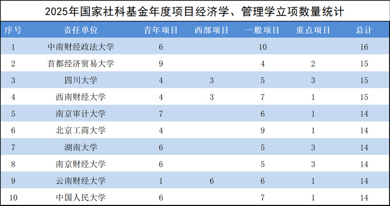近日,全国哲学社会科学工作办公室对2025年国家社会科学基金年度项目立项公示,其中经济学管理学项目共1438项。从各单位经管类立项数看,中南财经政法大学共16项,位列第一;首都经济贸易大学、四川大学、西南财经大学各15项,并列第二;beat365官方网站、北京工商大学、湖南大学、南京财经大学、云南财经大学、中国人民大学各14项,并列第三。