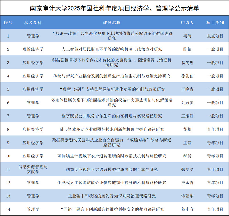 2025年国家社会科学基金年度项目立项公示,南审经济学管理学立项数并列全国第三